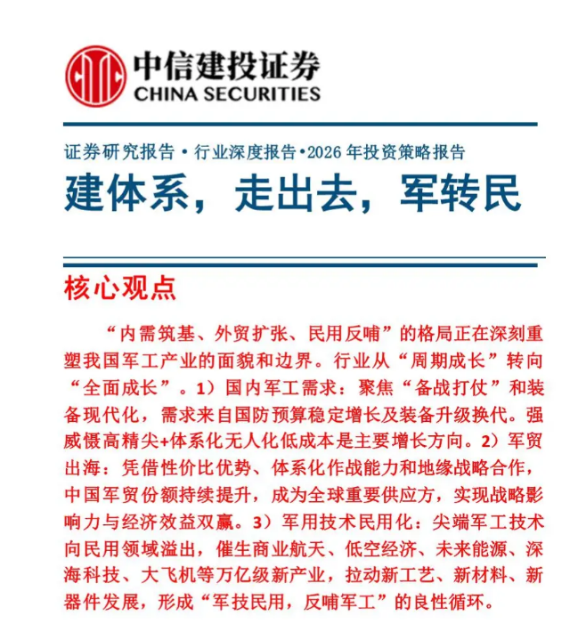 中信证券国防军工行业2026年投资策略报告:建体系,走出去,军转民。“内需筑基、外贸扩张、民用反哺”的格局正在深刻重 塑我国军工产业的面貌和边界。行业从“周期成长”转向 “全面成长”。1)国内军工需求:聚焦“备战打仗”和装 备现代化,需求来自国防预算稳定增长及装备升级换代。强 威慑高精尖+体系化无人化低成本是主要增长方向。2)军贸 出海:凭借性价比优势、体系化作战能力和地缘战略合作, 中国军贸份额持续提升,成为全球重要供应方,实现战略影 响力与经济效益双赢。3)军用技术民用化:尖端军工技术 向民用领域溢出,催生商业航天、低空经济、未来能源、深 海科技、大飞机等万亿级新产业,拉动新工艺、新材料、新 器件发展,形成“军技民用,反哺军工”的良性循环。